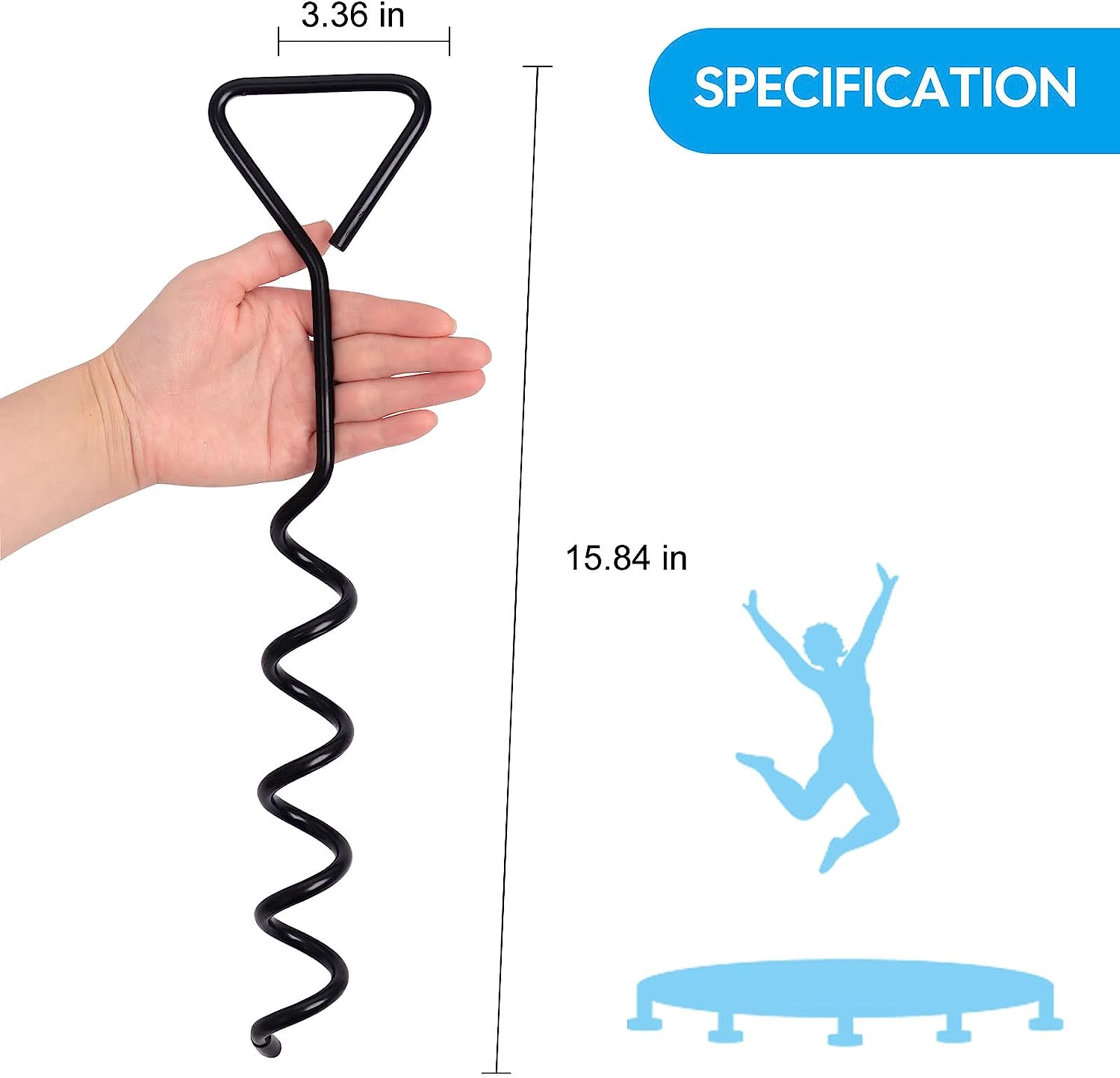 - ♫♫♫15.8inch Ground Anchors Trampoline Accessories:Trampoline accessories include 4 anchors and tie downs for tents, basketball hoop, swinging chairs, floor stands and all manner of outdoor gear!