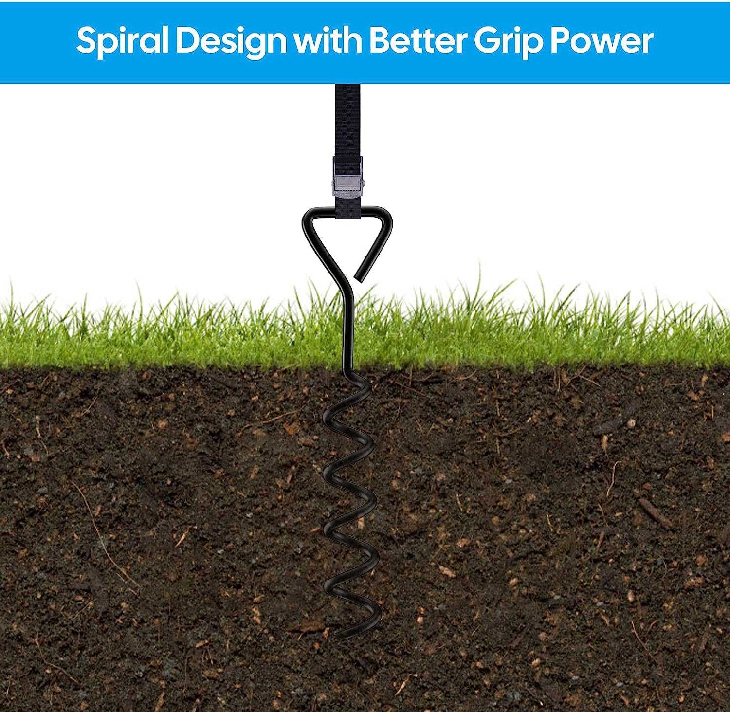 - ♫♫♫Trampoline Stakes Heavy Duty:Heavy duty corkscrew ground stakes twist deep into ground,and safety straps ( 98.5" length)with metal buckles withstand tension up to 660LB.