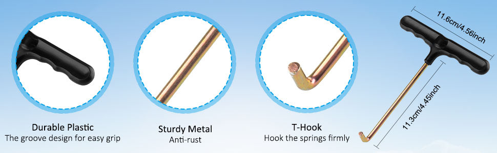 - Trampoline spring puller has plastic handle with finger grooves on it, easy to hold.you can also use 2 hooks at a time to increases the contact area with the hand, reduces the pain of the hand
