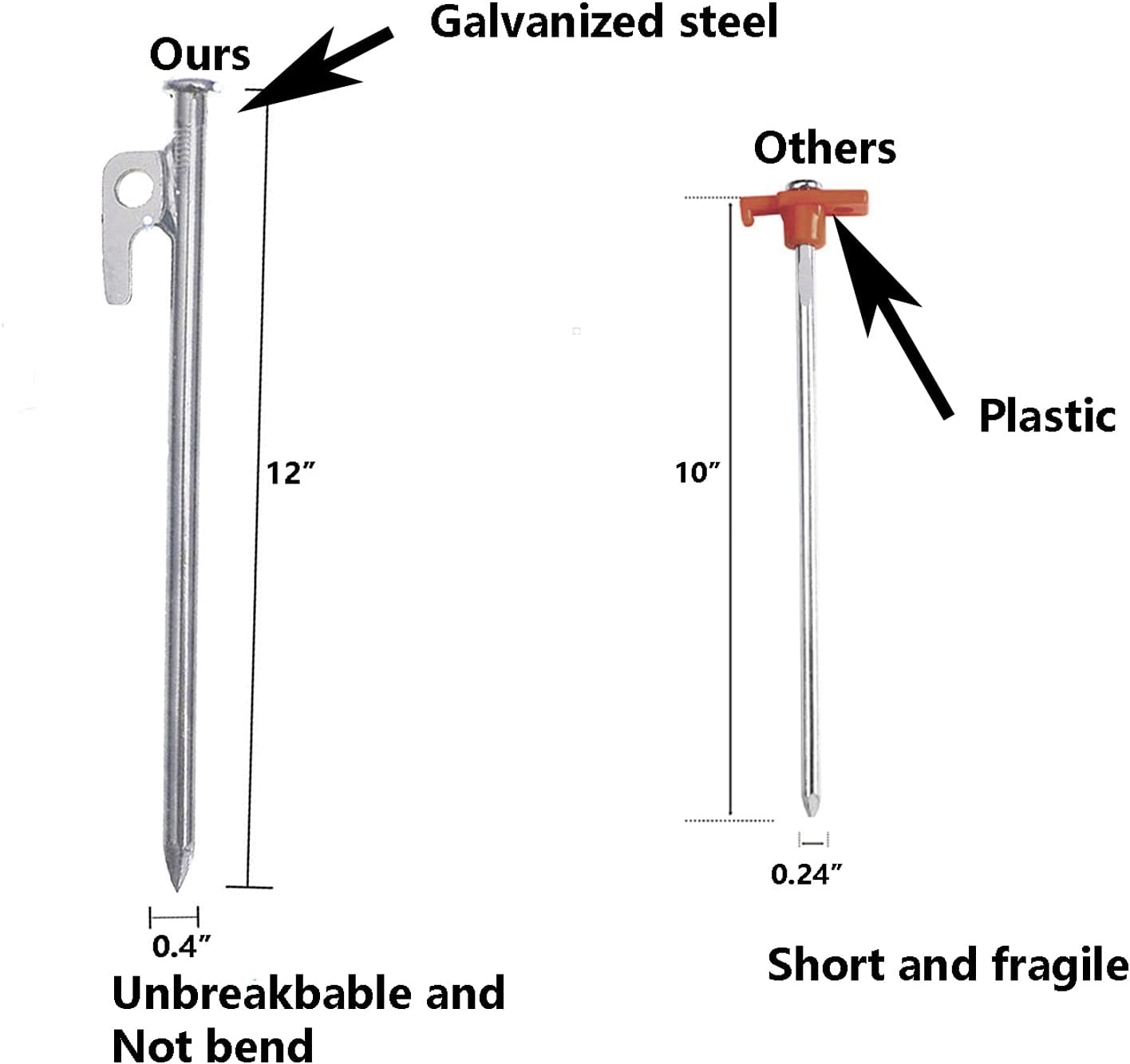 Reliable QualityThe tent stakes heavy duty are galvanized steel for corrosion resistance,completely get rid of the snapping and bending, more durability,.You tent can be hold firmly in a wide range of soil conditions |