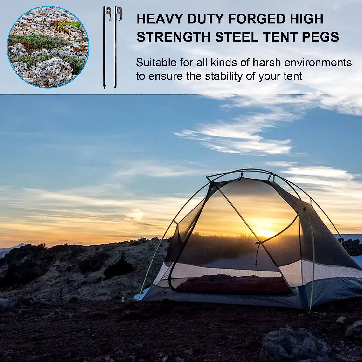 Great Holding PowerThe large head and sharp end of the tent pegs make it easy to penetrate hard or rocky ground, a safe choice to keep your stuff (tent, inflatable, outdoor display ...) from blowing away ! |